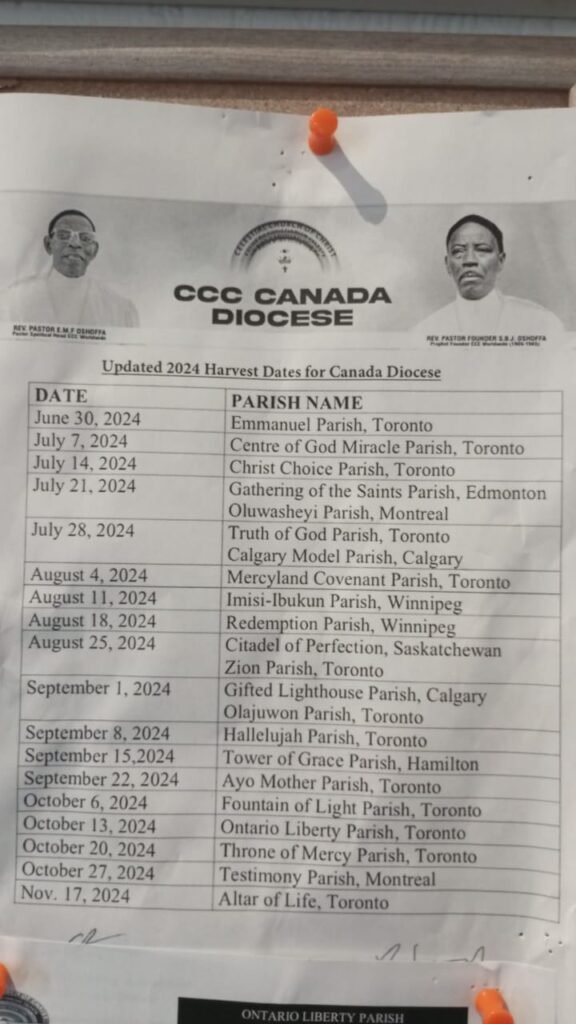 The Diocese is a body of Celestial Church of Christ Worldwide with International Headquarters at the Mission House; Ketu, Lagos State-Nigeria and U.S.A Canada Diocesan Headquarters at the office of the Head of Diocese (HOD) CCC Ontario Liberty Parish – 1322 Weston Road, Toronto, Ontario, M6M4R5.